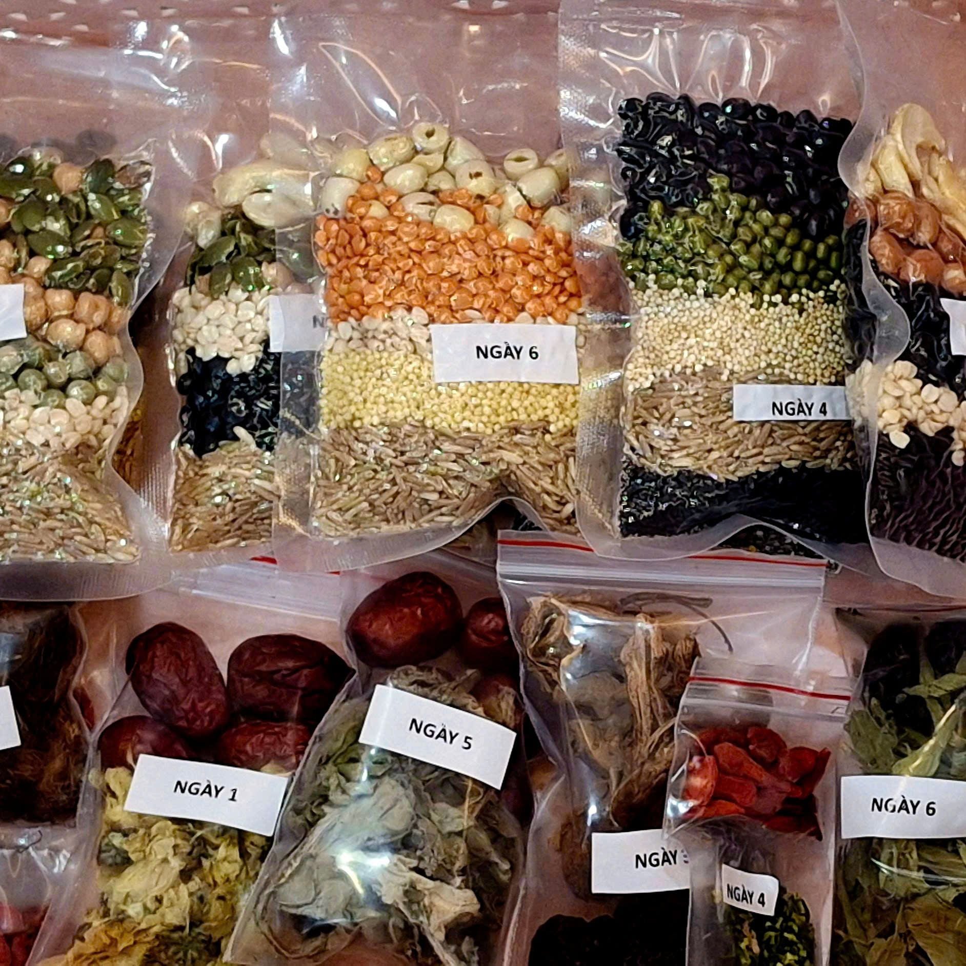 Gạo lứt trắng séng cù, gạo lứt đỏ Điện Biên, gạo lứt đen Tây Bắc, Đậu gà, đậu phộng, đậu lăng, đậu đen, đậu đỏ, đậu xanh, đậu Hà Lan, Yến mạch, hạt kê, bo bo, , diêm mạch. hạt bí, hạt điều, hạt sen, hạt chia, mè đen, táo đỏ tân cương, táo tàu đen, kỷ tử, cỏ ngọt, nhân sâm, râu bắp (râu ngô), lá atiso, tâm sen, củ gai, hoa cúc.